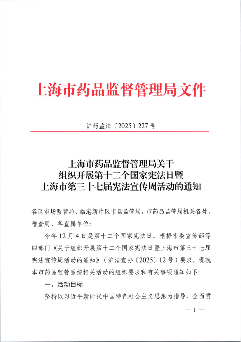 今年12月4日是第十二个国家宪法日。根据市委宣传部等四部门《关于组织开展第十二个国家宪法日暨上海市第三十七届宪法宣传周活动的通知》(沪法宣办〔2025〕12号)要求,现就本市药品监管系统相关活动的组织要求和有关事项通知如下: