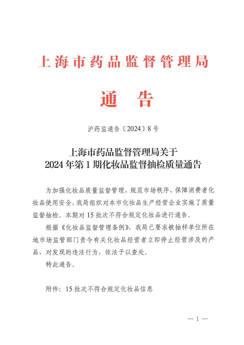 为加强化妆品质量监督管理,规范市场秩序,保障消费者化妆品使用安全,我局组织对本市化妆品生产经营企业实施了质量监督抽检。本期对15批次不符合规定化妆品进行通告。