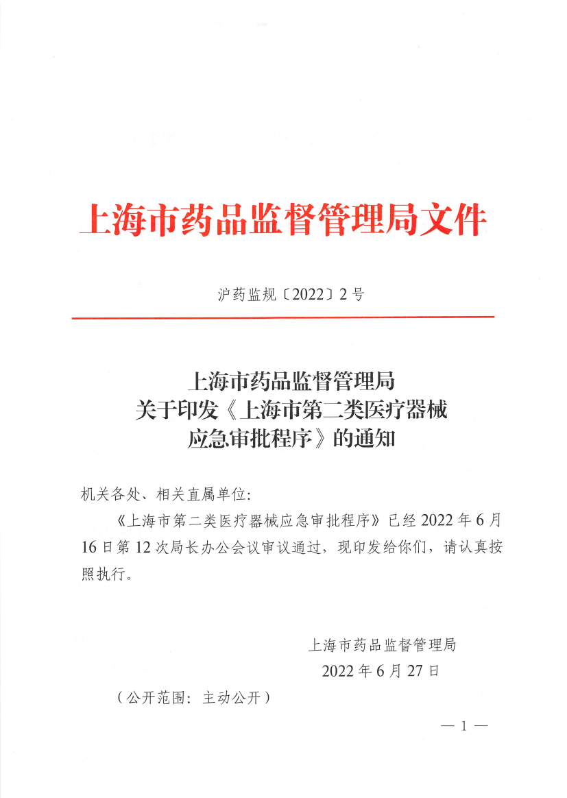 《上海市第二类医疗器械应急审批程序》已经2022年6月16日第12次局长办公会议审议通过,现印发给你们,请认真按照执行。