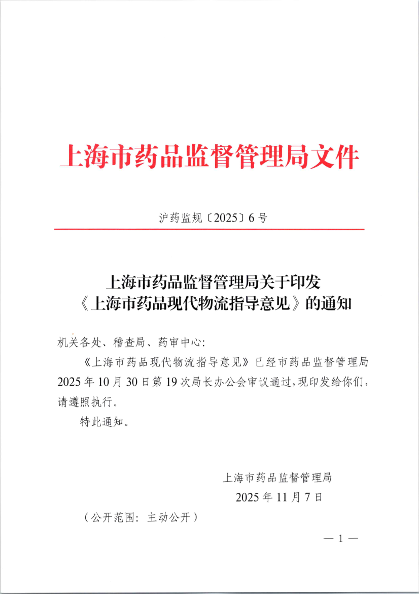 《上海市药品现代物流指导意见》已经市药品监督管理局2025年10月30日第19次局长办公会审议通过,现印发给你们,请遵照执行。